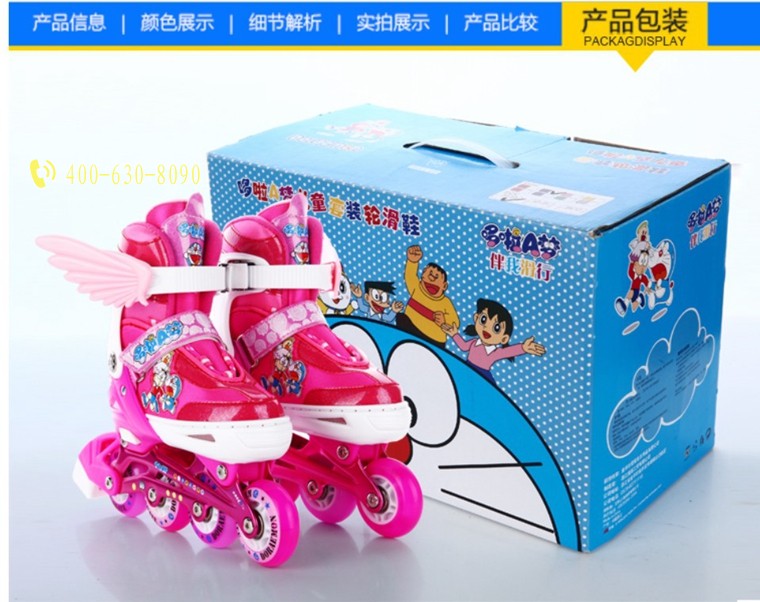 正品哆啦A梦儿童轮滑旱冰鞋直排轮动感全闪可调男女溜冰鞋全套装